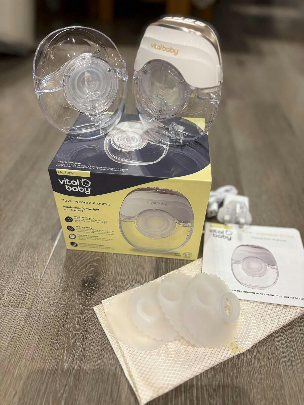 Included in the pack: 1 x hub, 2 x milk collectors, 2 x air inlet valves, 2 x diaphragms, 2 x diaphragm covers, 4 x valves, 17mm, 19mm, 21mm & 24mm shells, 1x nipple sizing guide, 2 x bra extenders, 1 x travel & storage bag & 1 x charging cable & plug